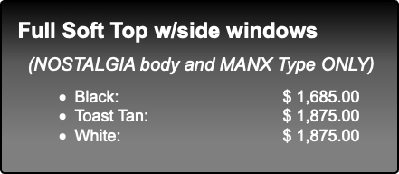 The Full Soft Top and kit comes with all Stainless Steel Hardware, SS snaps, SS mounting pins, a full storage bag, and a boot cover to store the soft top while folded down still on the buggy. ACME can also install onto your buggy at our regular hourly rates. Please contact us if you have any questions. Click HERE to learn more.