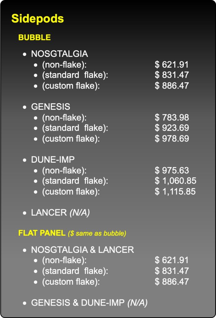 Take our body sidepods, for example. In the early days, sidepods were one of the first custom touches buggy owners added to their cars. Besides giving the buggy a sleeker, more finished look, the bubble sidepods provided extra space for build-in speakers or some custom storage. Our ACME sidepods are designed to complement our body styles perfectly, flowing naturally with the lines of the buggy just like the period pieces that inspired them.