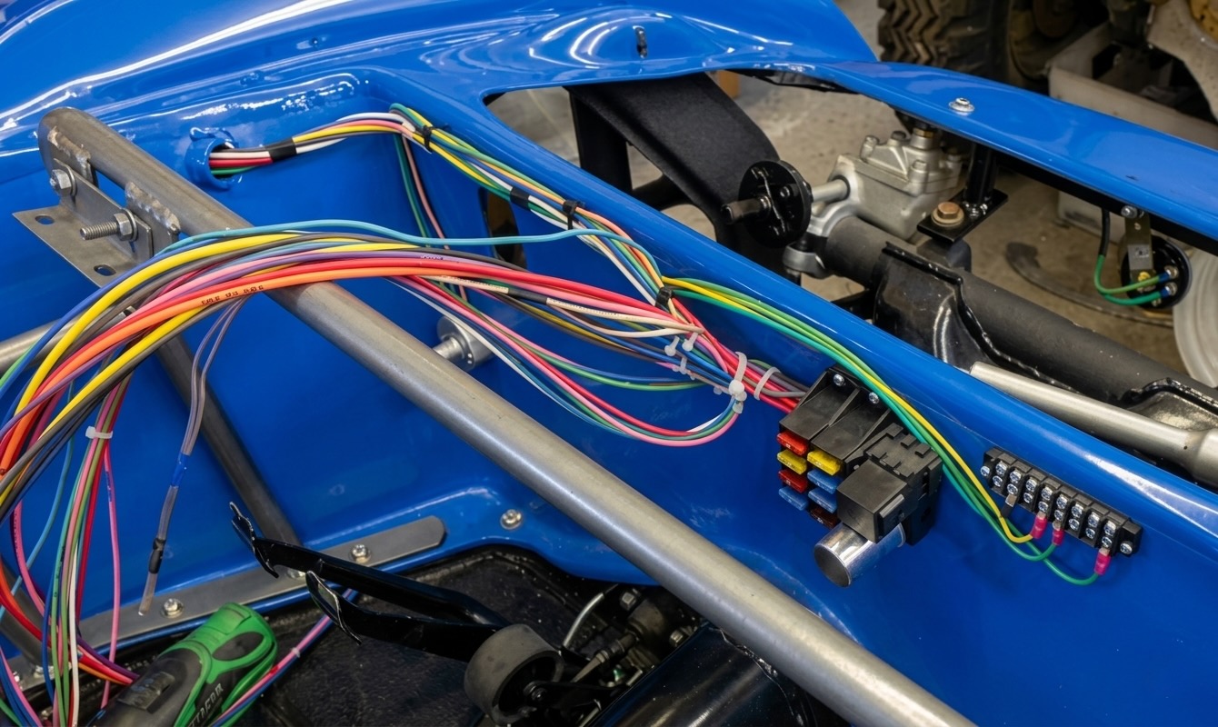A fiberglass-bodied vehicle does not provide a natural ground path. Every electrical component—lights, gauges, accessories—must have its own dedicated ground path to the steel frame. The battery must be grounded to the frame, and the engine must also be grounded to the frame. These are not optional steps.